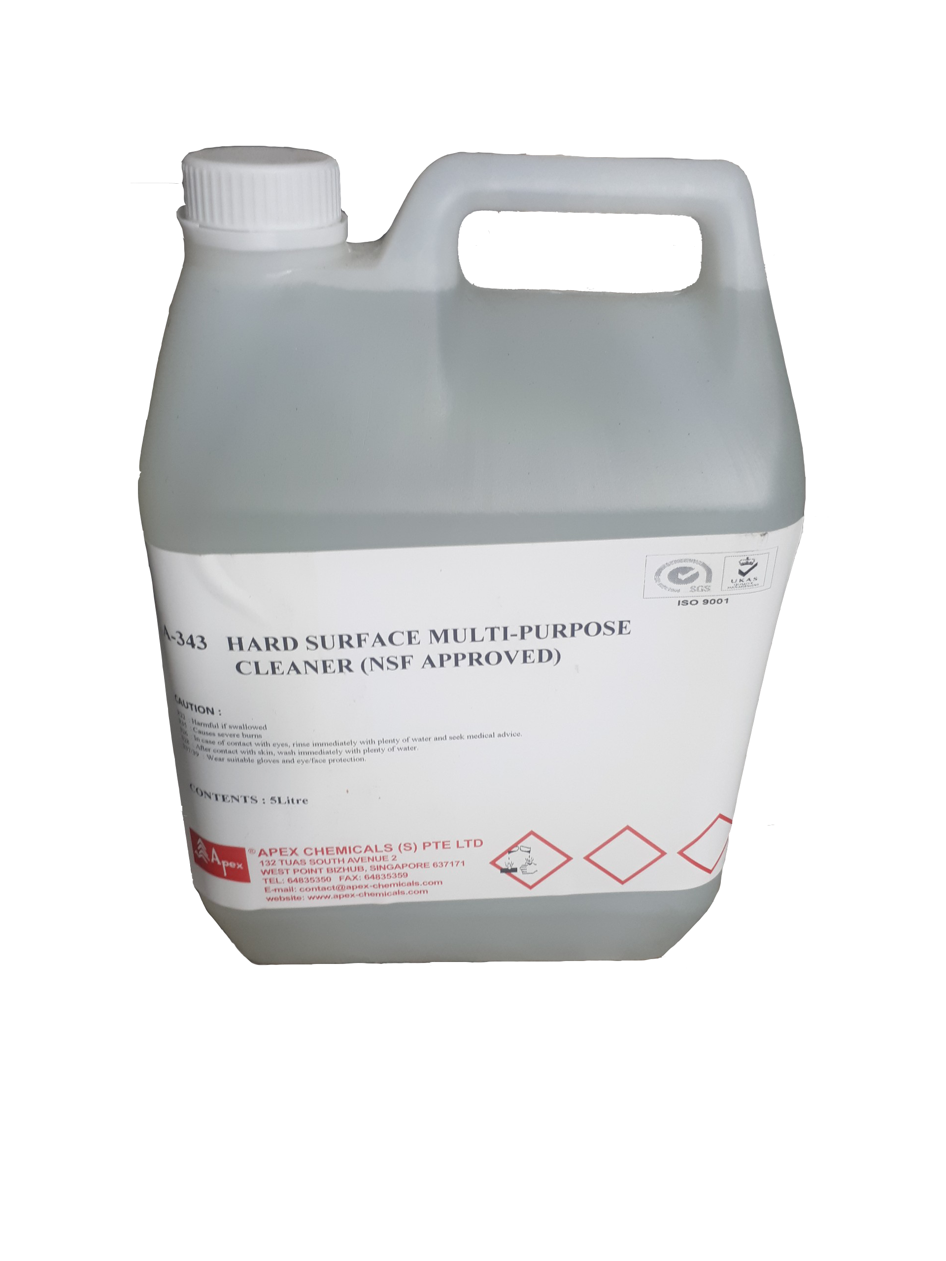 A-343 là chất tẩy rửa đa năng dùng vệ sinh tẩy rửa bề mặt thiết bị, dụng cụ sử dụng trong khu vực nhà bếp của nhà hàng, bếp ăn công nghiệp và được sử dụng phổ biến và được chứng nhận an toàn thực phẩm bởi tổ chức quốc tế NSF Registered Product.